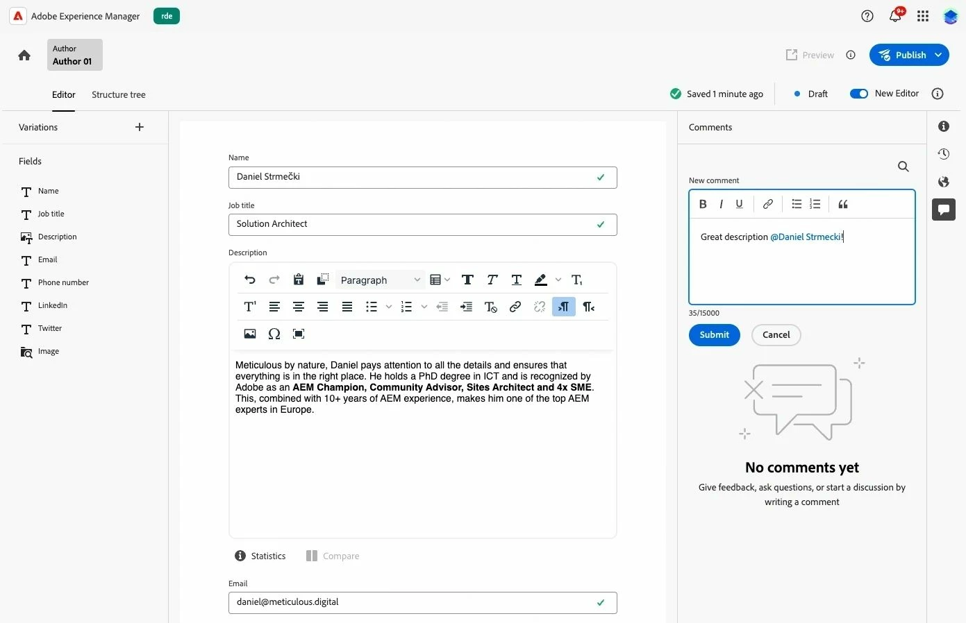 - Supports the same CF model fields as the classic editor, allowing for the creation of structured content with predefined data types