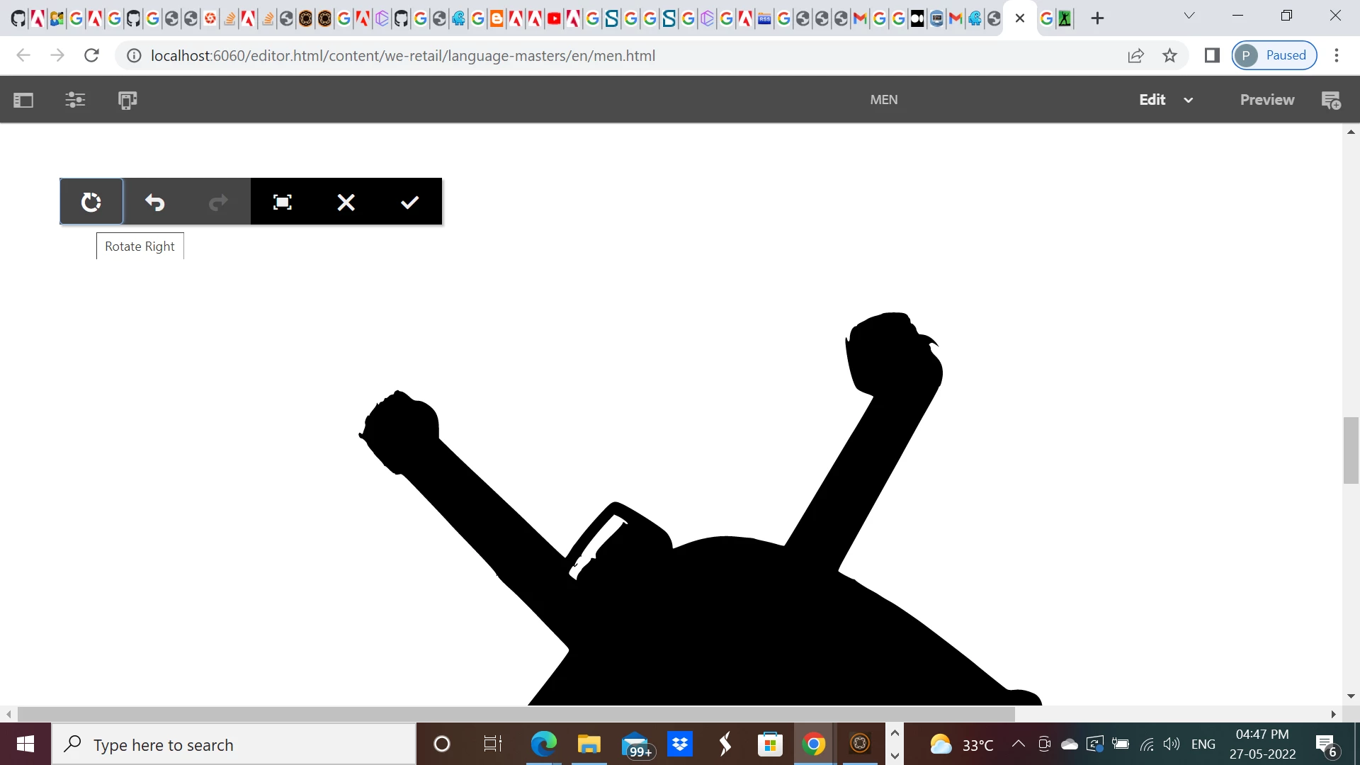 I have created test image component under we.retail component group with your provided .content.xml and _cq_editConfig.xml , rotate functionality is working for .svg file -
