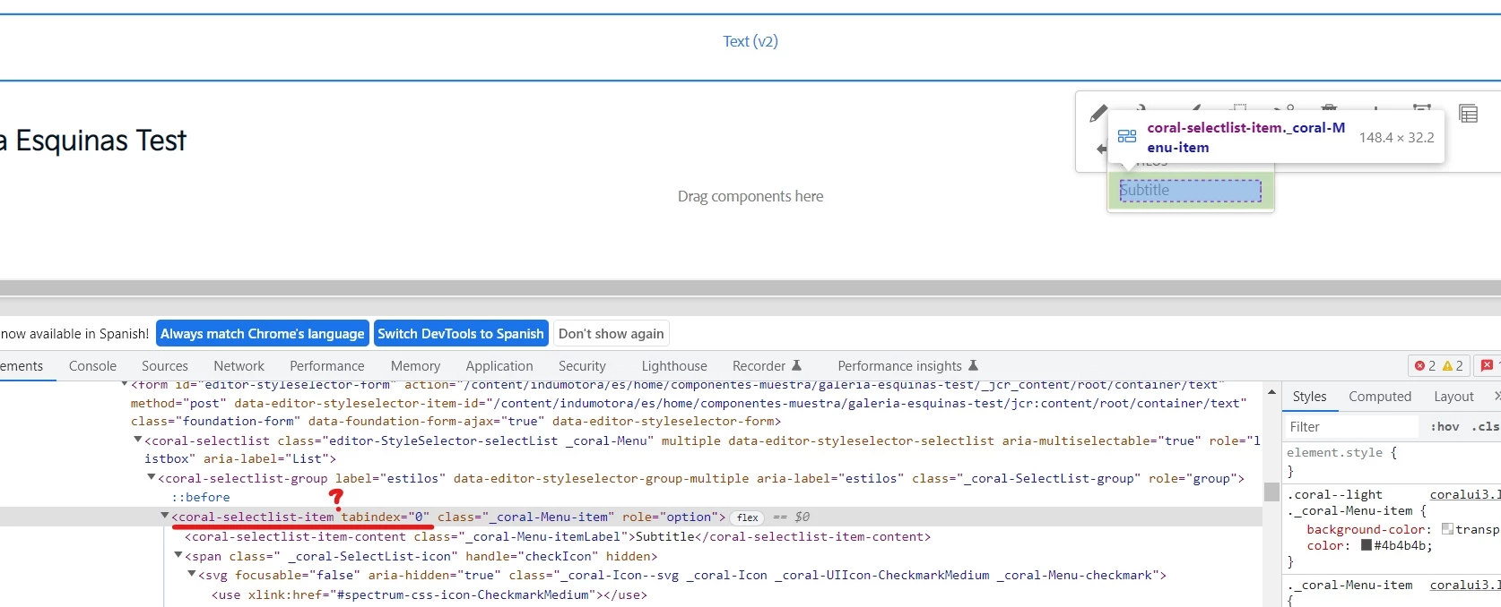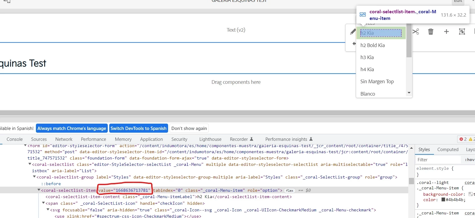As a reference I'm attaching two images, one is "working-style" which is from the Title(v3) component, where the list items have a value and the selection works, and the other is "broken-style" wich correspond to the Text(v2) componet where you can see the missed "value" attribue.