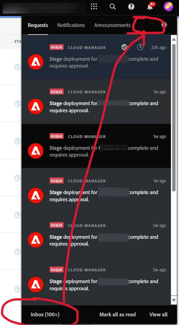 | Use-case: | On AEM as a Cloud the notification icon(on Navigation bar) opens the popover, where the inbox is at the bottom and kind of hides it from Business users. Why not move it on the same level as Request, Notifications & Announcements or provide an option to configure this. |