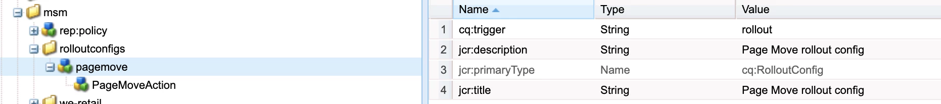 1) Created a PageMoveAction rollout config with path /apps/msm/rolloutconfigs/pagemove