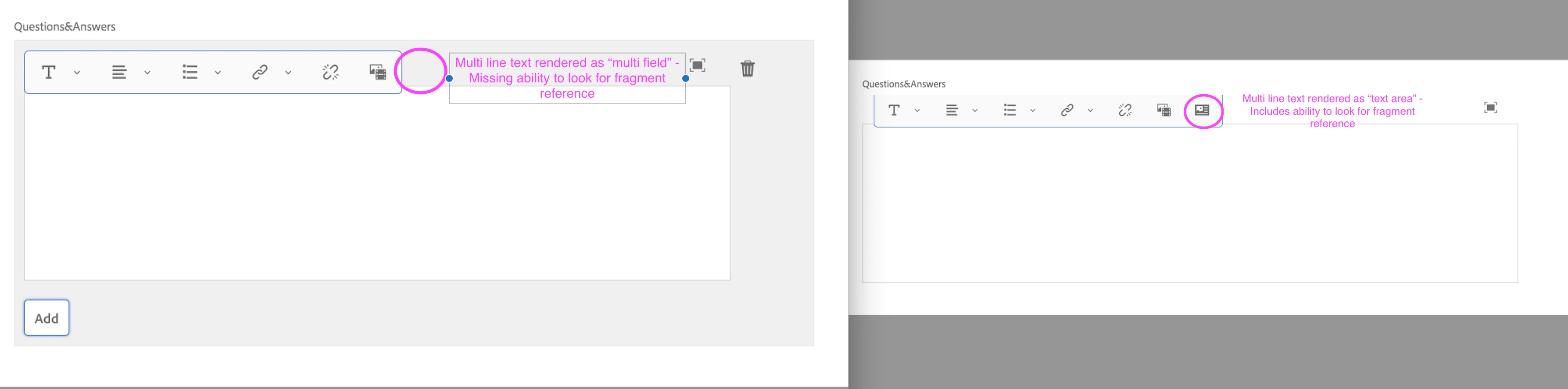 I'm able to embed a fragment reference when the multi line text is rendered as "text area." Why allow me the ability to select "Allow fragment reference" if I cannot actually utilize this when "multi field" is selected?