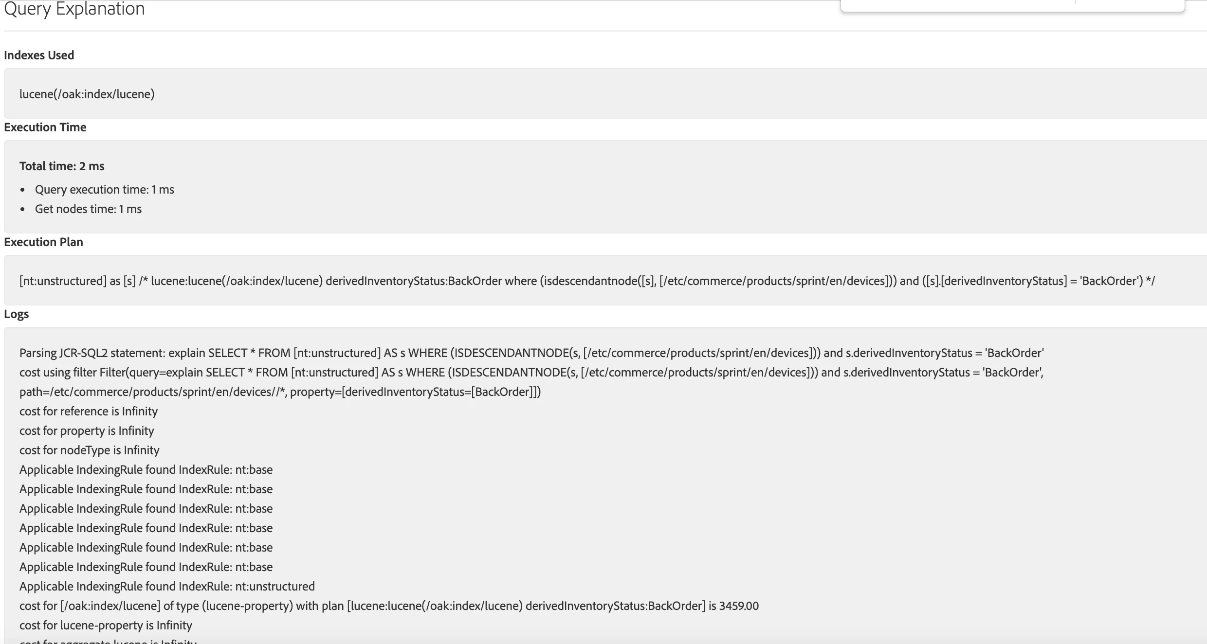 Query: SELECT * FROM [nt:unstructured] AS s WHERE (ISDESCENDANTNODE(s, [/etc/commerce/products/myProject/en/devices])) and s.derivedInventoryStatus = 'BackOrder'