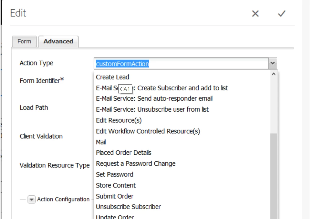 But I cannot advanced options in my form container and thus i cannot define the custom form action. The tutorial shows this image: