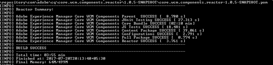 I have build plugins and configurations same as aem-core-wcm-components/pom.xml at master · Adobe-Marketing-Cloud/aem-core-wcm-components · GitHub