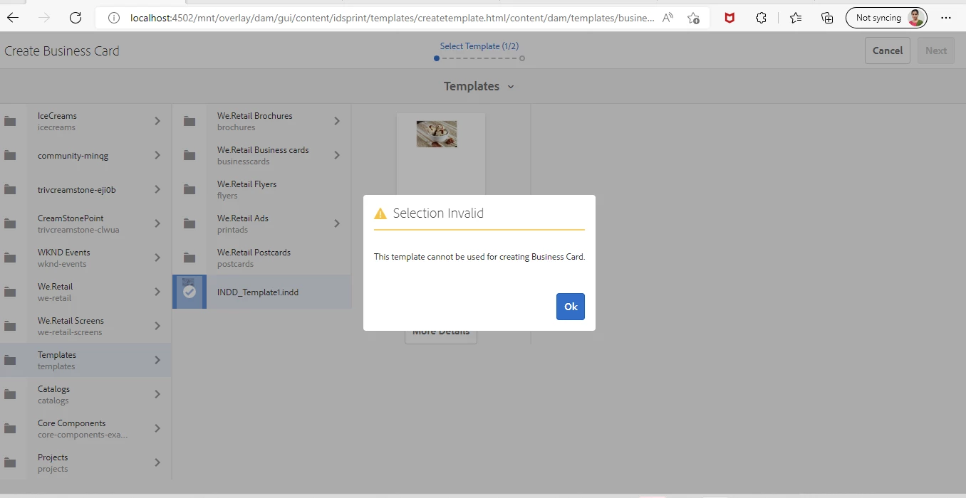 Added a created INDD template on Assets, but not able to create the business cards