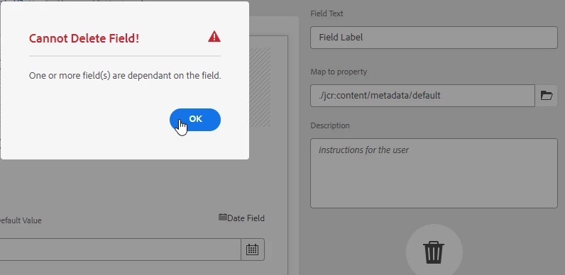 In your particular example it looks that one or many fields in your schema has a Rule that rely on different field, and you are trying to remove the field that is dependency to others.