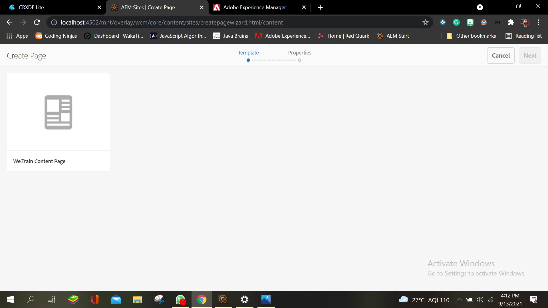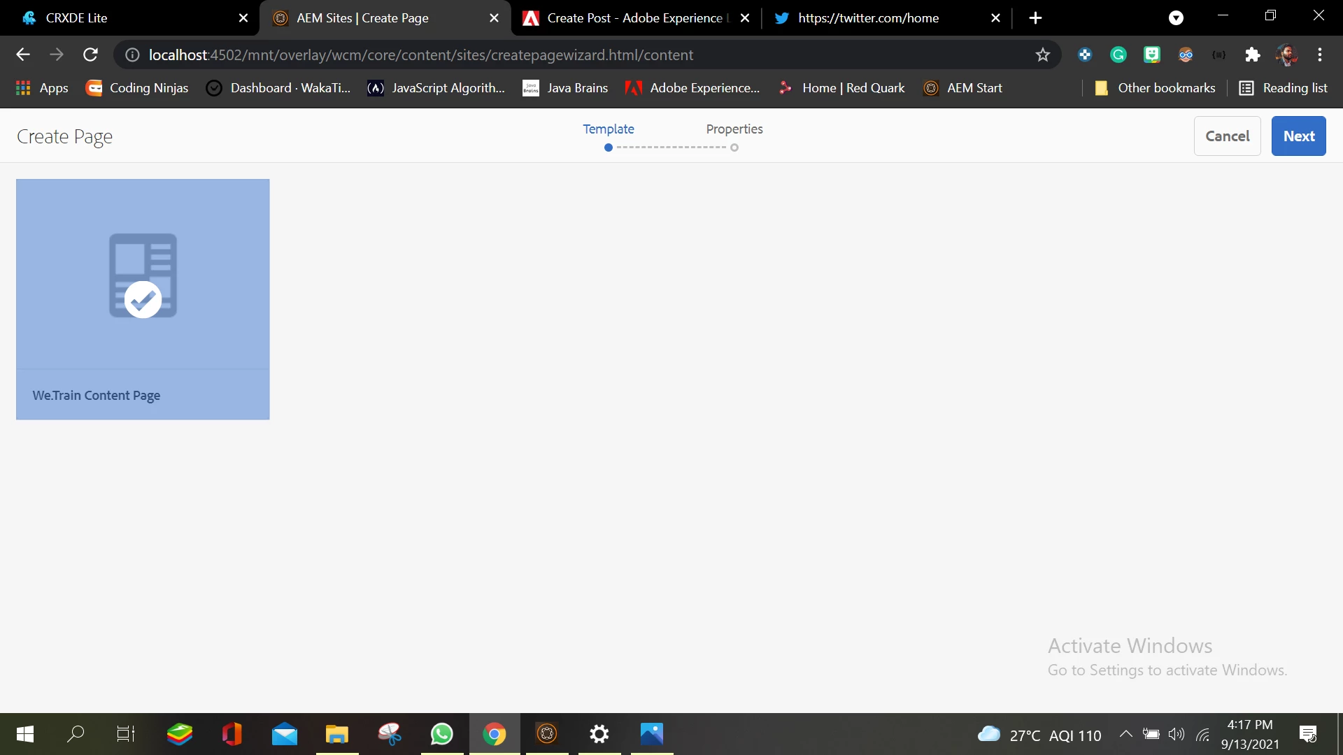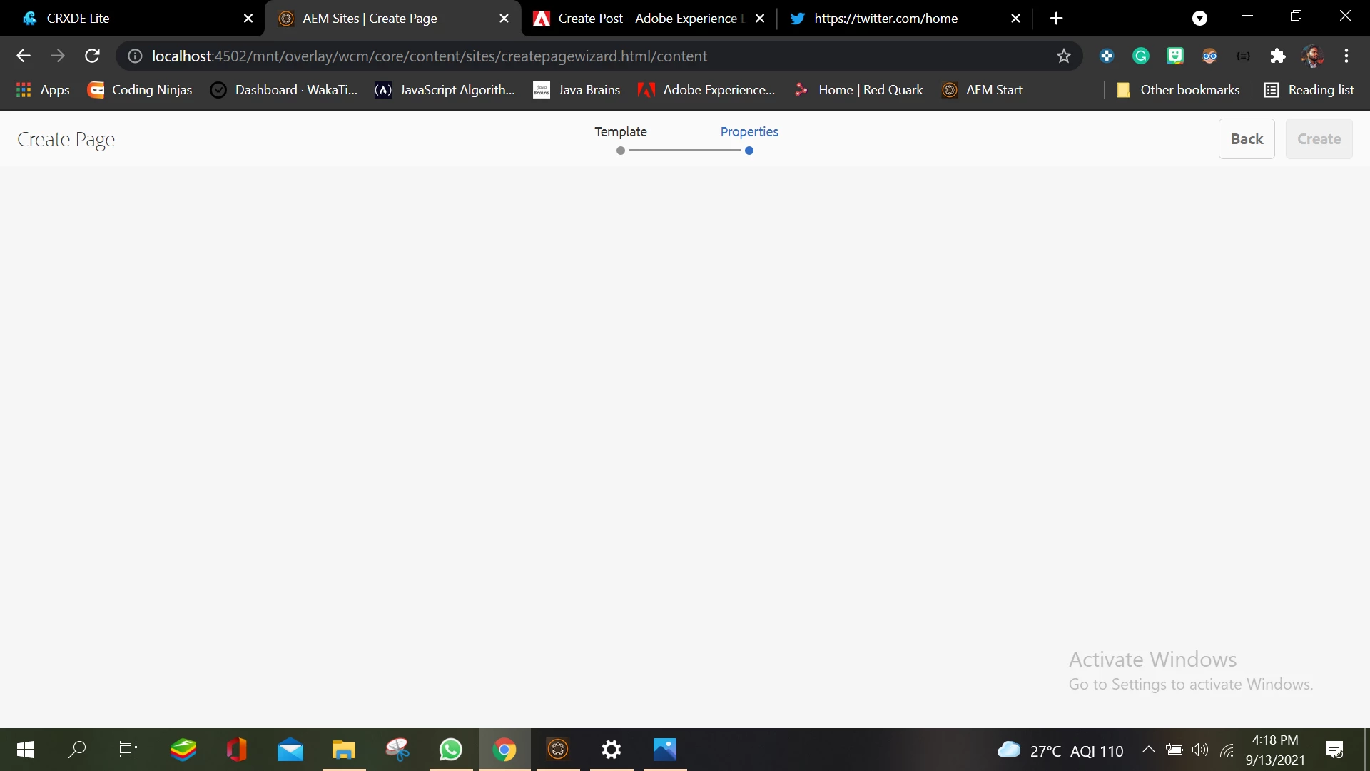 Not able to enter the properties of a page(name , title ) while creating it with a template