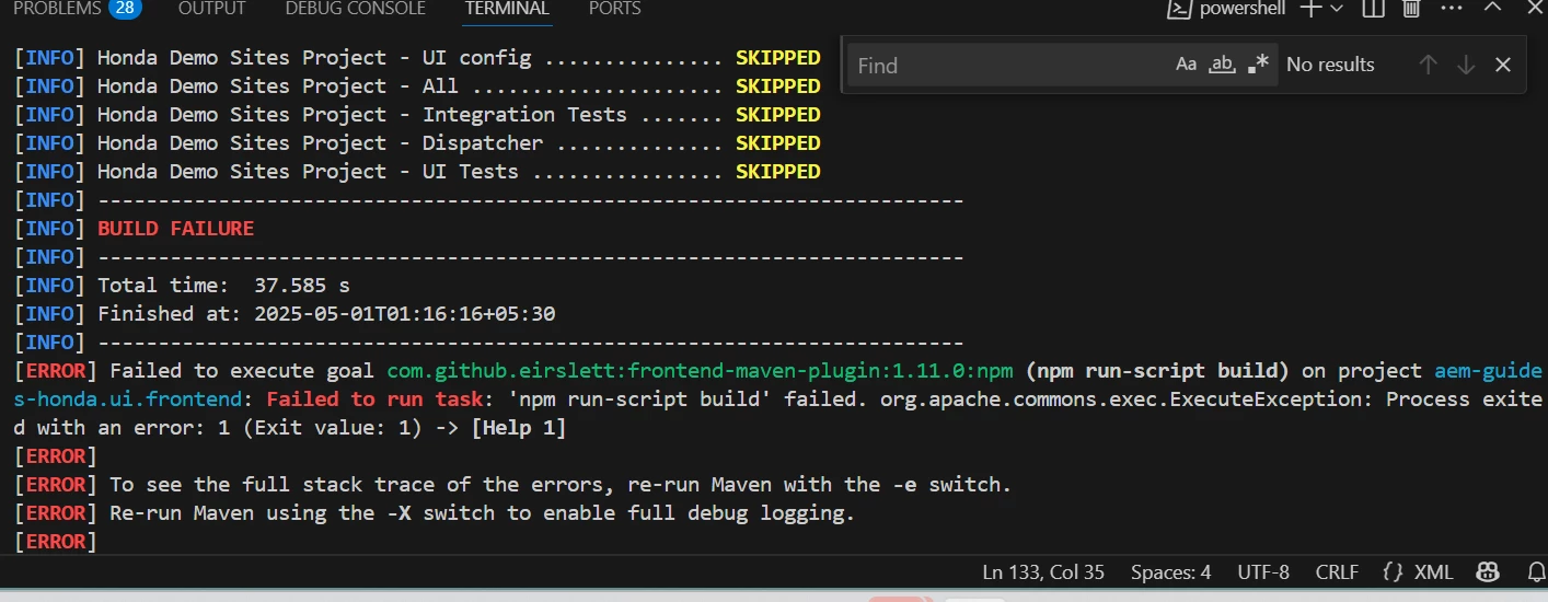 This indicates the npm run build command inside the ui.frontend module is failing, but Maven doesn’t show exactly why. Here's how you can resolve it: