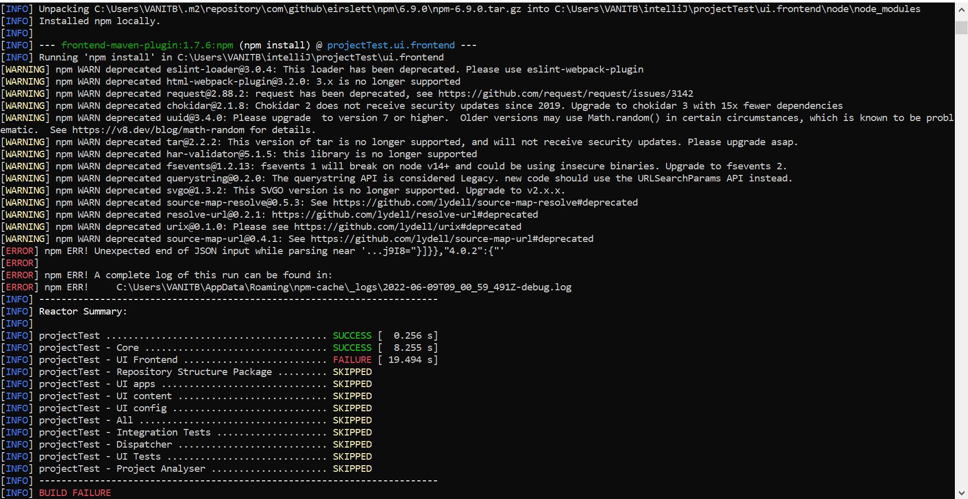 I am trying to run a maven project. But it throws the below error. I have tried many ways like changed the node verstion, installed new/updated node then ran npm install under ui.frontend but nothing works out. Can anyone tell me the solution for this ?