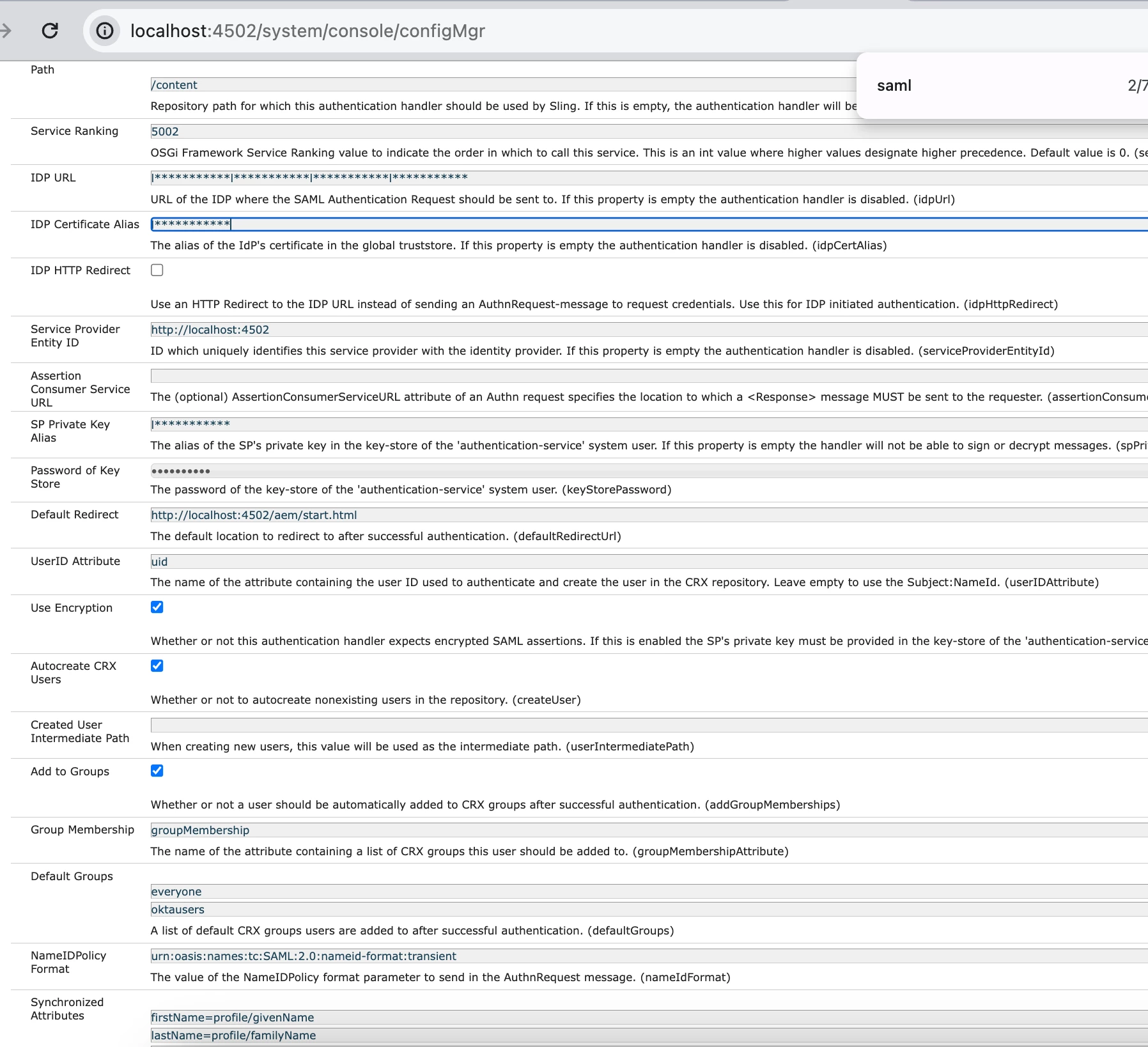 Service provider is http://localhost:4502 on SAML side.