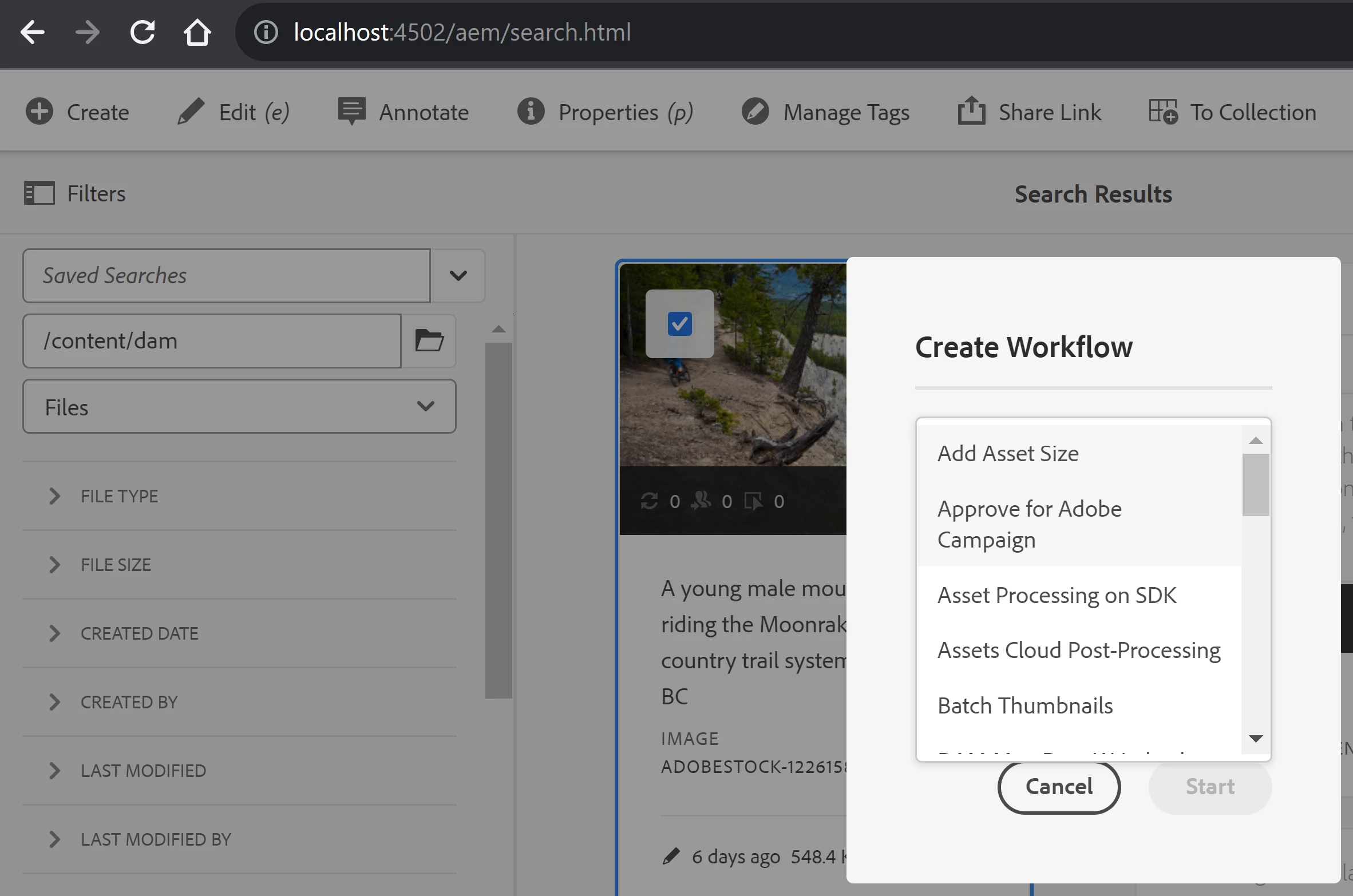 I have a custom requirement where the author wants to activate through workflow more than one asset using search filter option. a button needs to be available to start a workflow but i'm not able to find whether I need to overlay from libs or create a custom js.