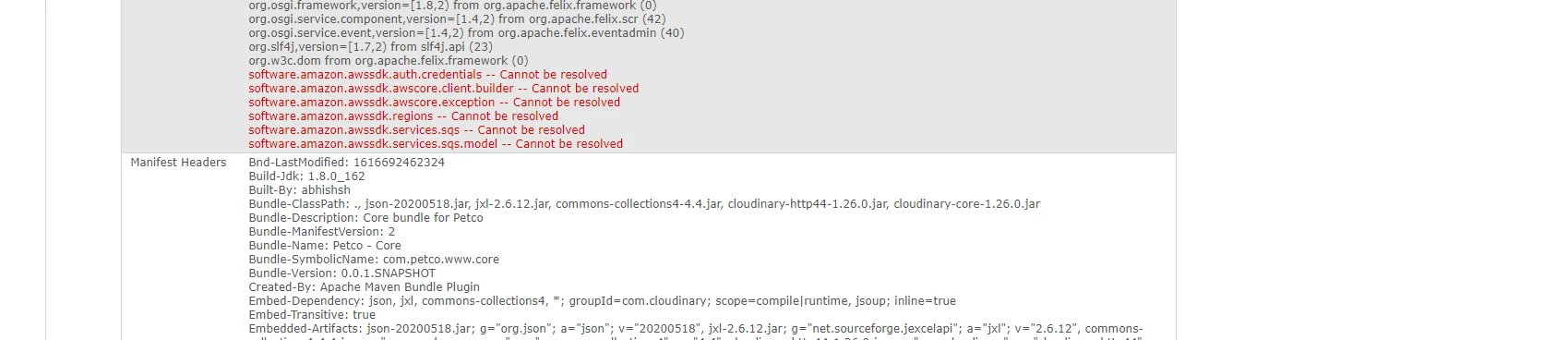 I have put my custom logic which is leveraging AWS SQS inside the core bundle. On deployment, AWS packages are not getting resolved at Felix Console.