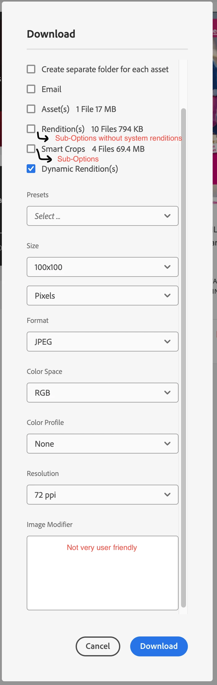 | Aktuelles/erlebtes Verhalten: | The Download option does not tell the user what this all contains. He will get every available rendtion (even those that are only useful for the system) and every smartcrop that is available for his selection. He does not see which options his download will contain. He can not opt out of the unnecessary options. |