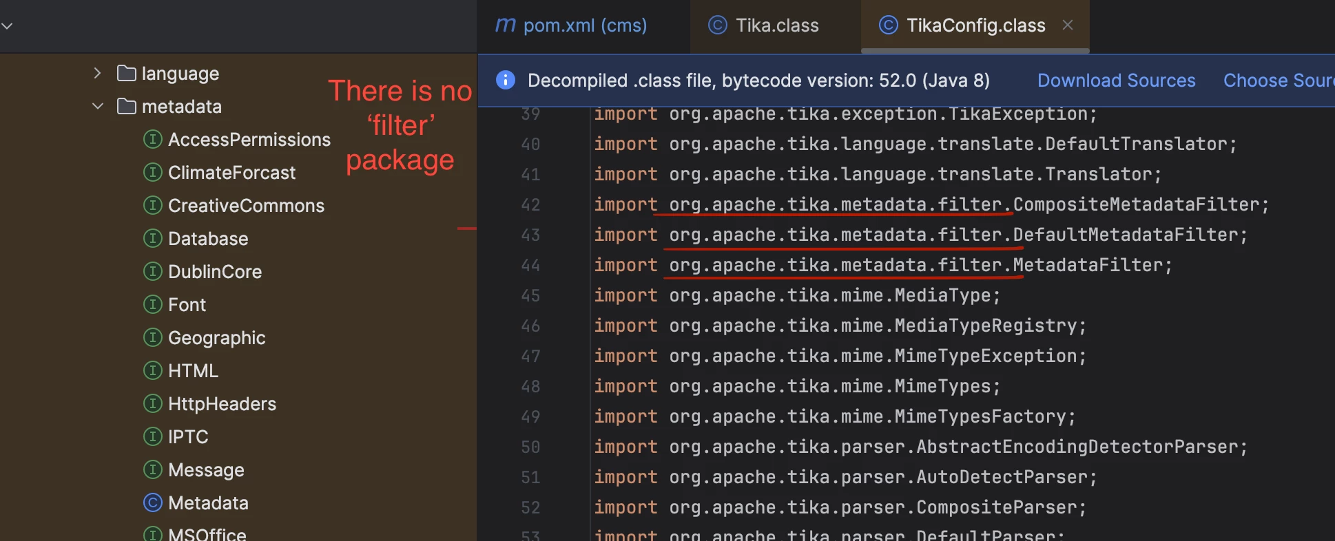 Looking at javadocs and the decompiled class there should be this package https://javadoc.io/doc/org.apache.tika/tika-core/latest/org/apache/tika/metadata/filter/package-summary.html