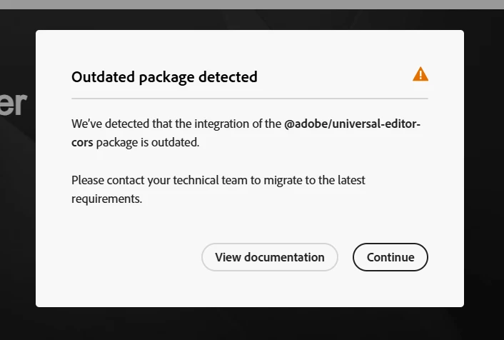 Description: We've detected that the integration of the @61380/universal-editor-cors package is outdated. Please contact your technical team to migrate to the latest requirements.
