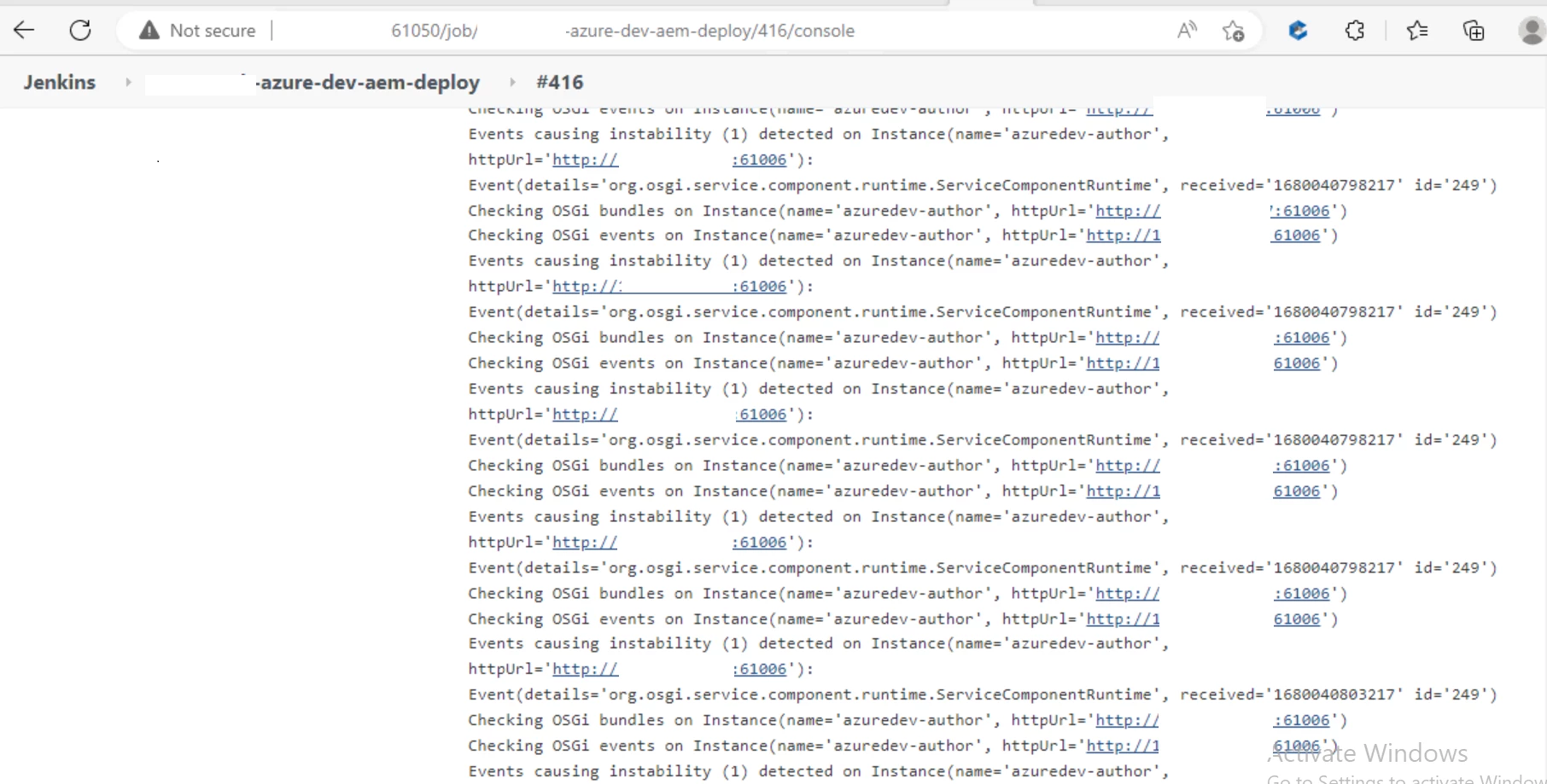 Checking OSGi events on Instance(name='azuredev-author', httpUrl='http://<ipaddress>:61006')