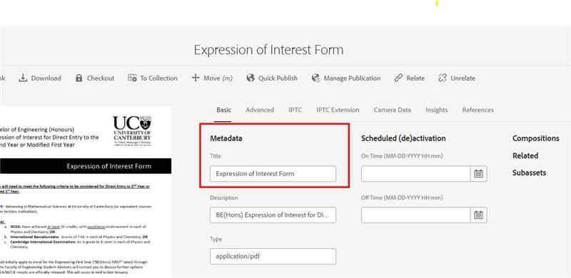 When a PDF file is created, it contains its own set of internal metadata, including a Title. This metadata is an integral part of the file itself. When you upload a PDF to the AEM DAM, AEM ingests and extracts this metadata, and it also allows you to add its own DAM metadata, such as dc:title (often called MetaTitle in AEM's properties). However, when a user accesses the PDF file directly via a URL (e.g., https://your-aem-site.com/content/dam/your-project/document.pdf), the user's browser doesn't communicate with AEM's content management system to get the dc:title from the DAM. Instead, the browser simply reads the binary file and displays the title that is embedded within that PDF. Think of it as when you share or open a direct PDF URL (e.g., /content/dam/.../file.pdf), browsers and social crawlers don’t read an HTML <title>. They use the PDF’s embedded metadata (Document Title / XMP) or simply the filename. Changing “Title/MetaTitle” in AEM does nothing to the binary unless you write it back into the PDF.