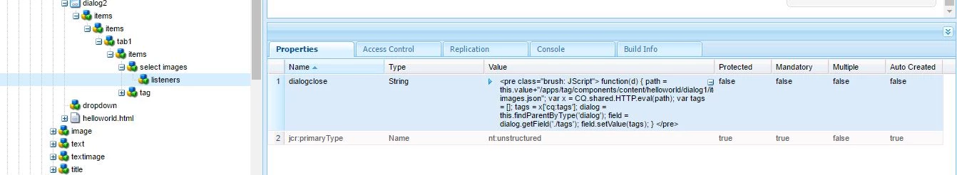 function(d) { path = this.value+"/jcr:content/metadata.json"; var x = CQ.shared.HTTP.eval(path); var tags = []; tags = x['cq:tags']; dialog = this.findParentByType('dialog'); field = dialog.getField('./tags'); field.setValue(tags); }Let me know if you face any issue.