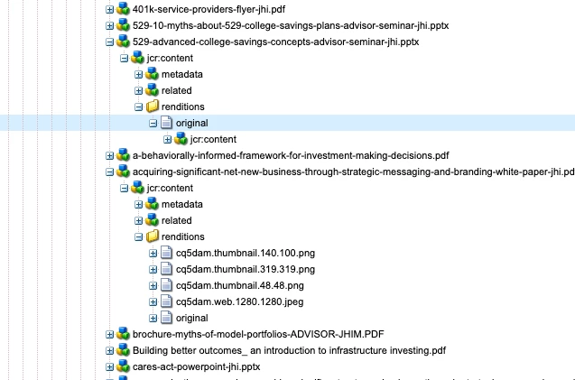 PowerPoint files are not generating thumbnail images under /jcr:content/rendtions after being processed through the "batch thumbnails" workflow. The workflow is working fine for PDF files. (please see attachment) In the log, I see this error: college-savings-concepts-advisor-seminar-jhi.pptx is not in list of accepted mime types Also we're running on AEM 6.5.10.