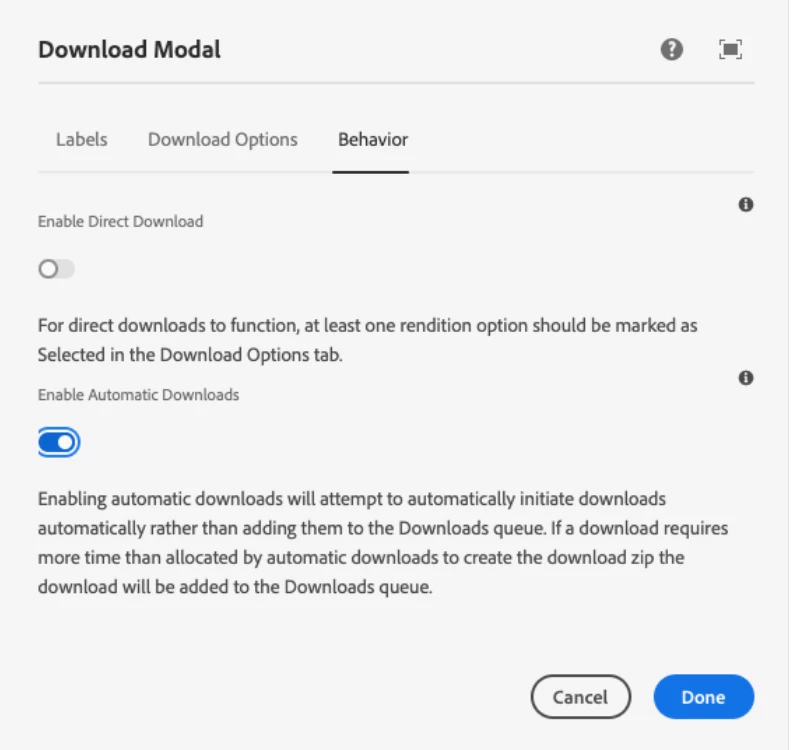 To my knowledge ASC provides control over how assets are shared and accessed, but the auto-download behavior might not have a direct configuration setting. However, you can try to manage this behavior indirectly using