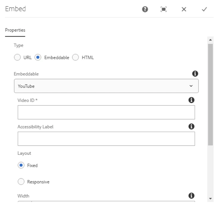I am working on creating proxy component for youtube Embeddable using v2 core Embed. I want to overlay embeddable youtube and remove few ootb fields like Accessibility Label, width, height etc. I tried overlaying the youtube embeddable component and pointing to the core youtube embeddable. Still unable to remove the fields. How can I achieve this?