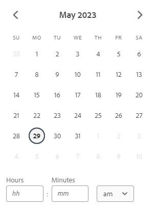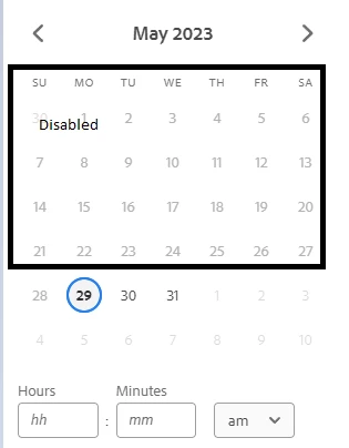 @shubhanshusi2, the minDate property works as intended. However, it just adds a date constraint. The use case is to prevent them from selecting a time in the past. How can I prevent them from selecting a past time?