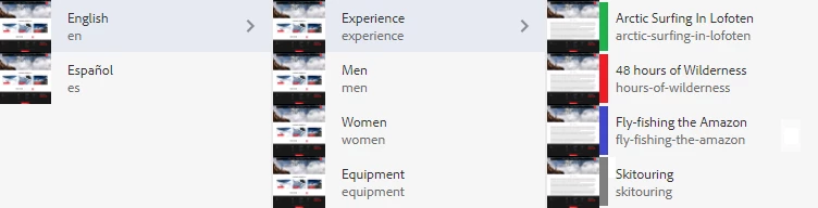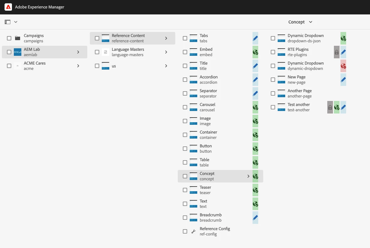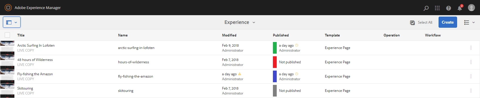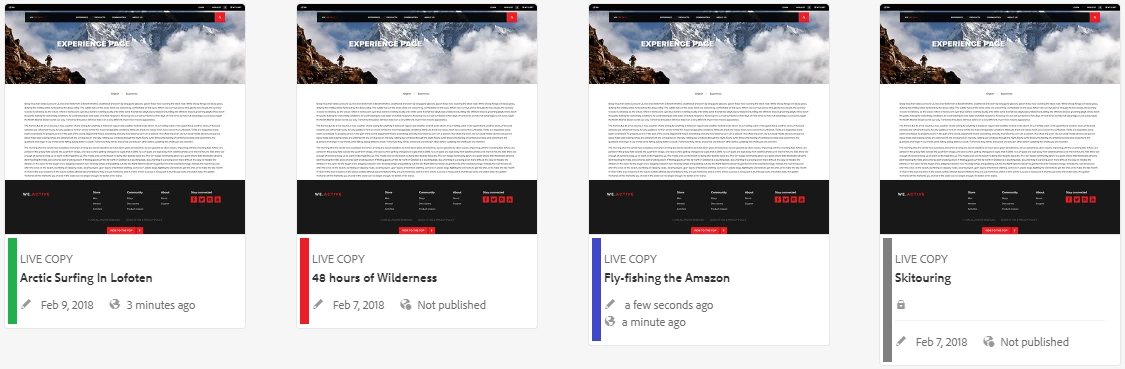 Use-case: People with access to an AEM author should be able to be quick in recognizing a node as “never published”, “published”, “unpublished”, “modified” and/or “locked”. This should be true in each of the view modes, “Card View”, “Column View” and “List View”.