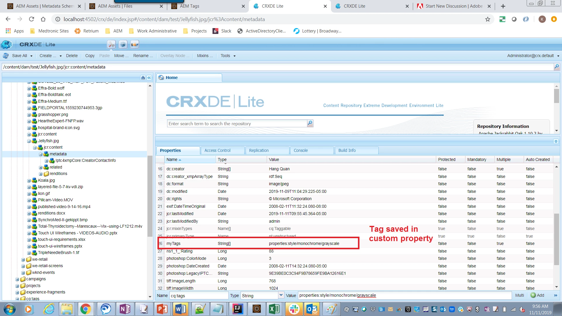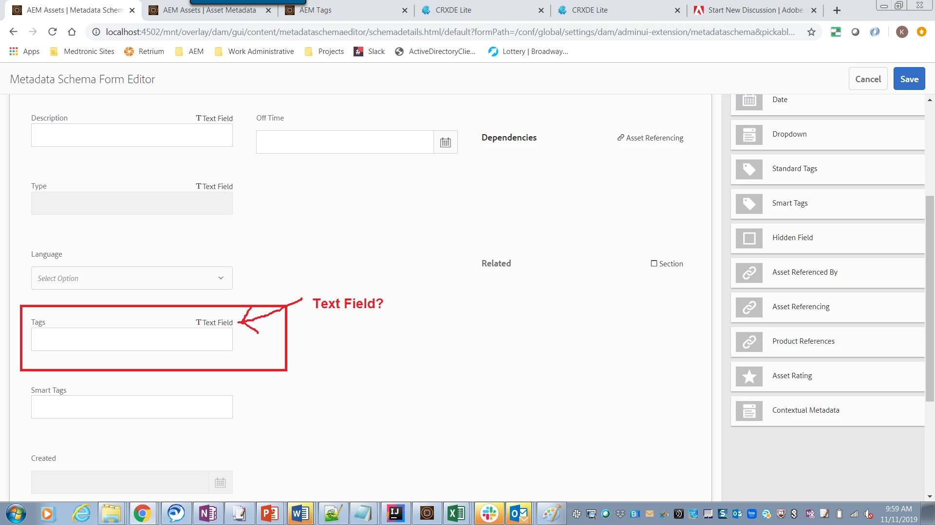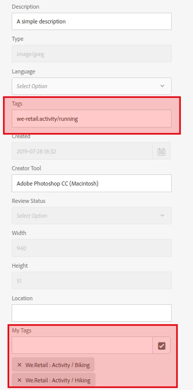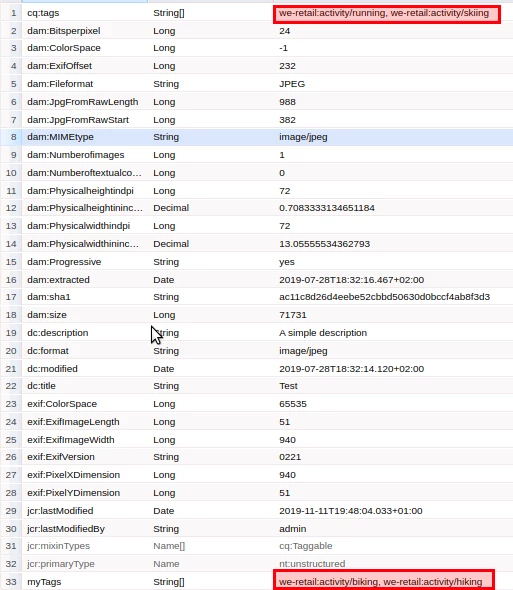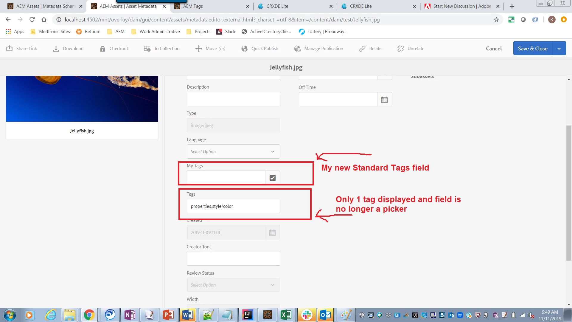 - I’ve customized the default metadata schema by adding a Standard Tags field to it. This new field maps to a custom property (for instance: ./jcr:content/metadata/myTags). After doing this, the out-of-the-box Tags field no longer works properly: