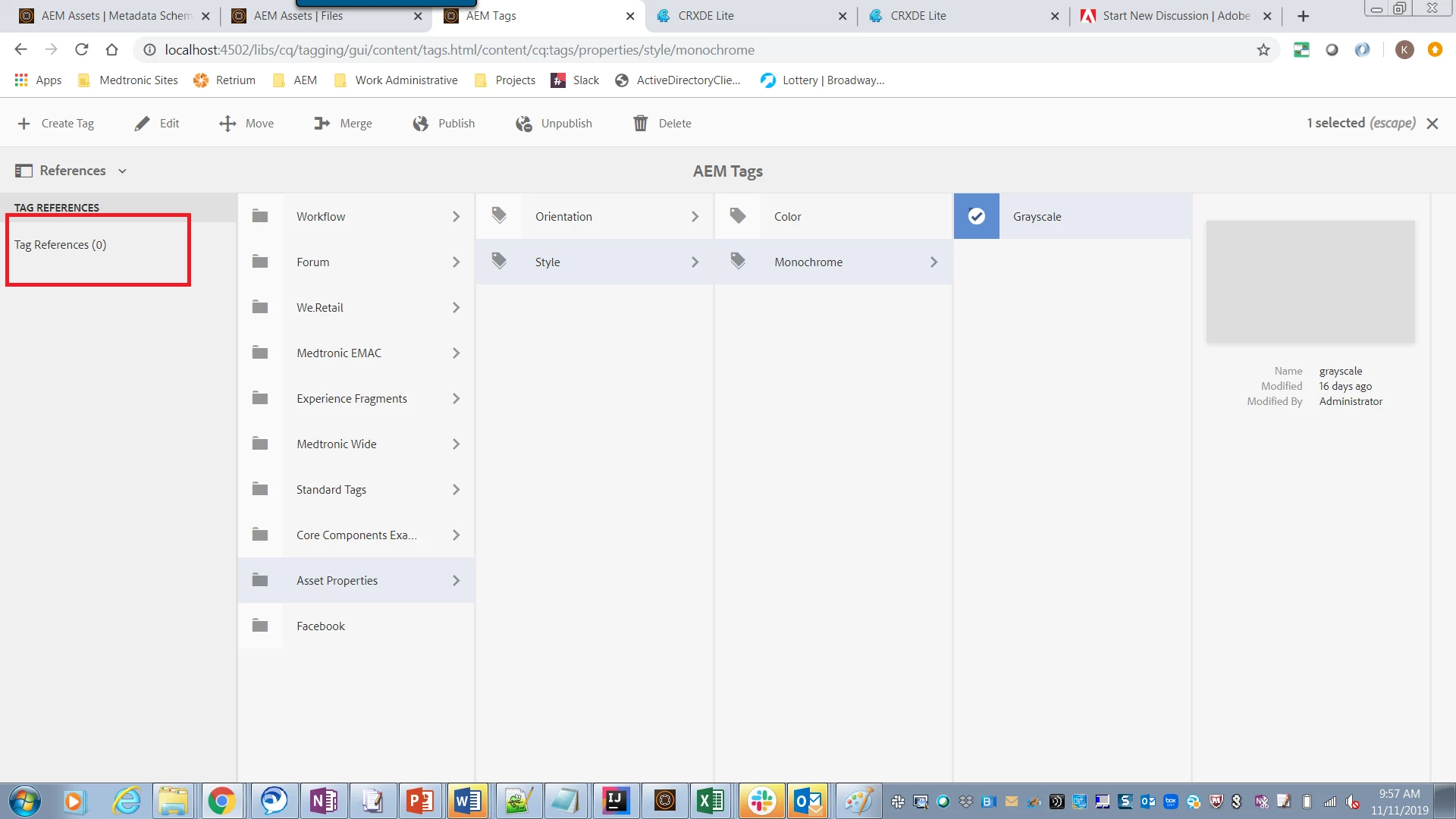 2. The out-of-the-box Tag References feature doesn't seem to work for tags saved in custom properties. For instance, in the screenshots below, I've saved the "Grayscale" tag to the custom property "myTags". Yet, there is no reference displayed for it in the Tags UI:
