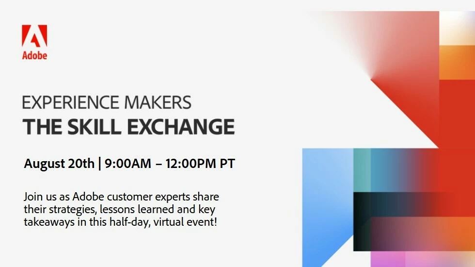 The full Skill Exchange program runs from August 13–21, spotlighting 6 Adobe Experience Cloud products over 4 value-packed days: