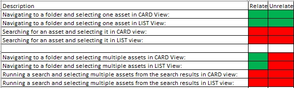 Relate/Unrelate option visibility issue : Scenarios: 1] Navigating to a folder and selecting one asset in CARD View: 2] Navigating to a folder and selecting one asset in LIST View: 3] Searching for an asset and selecting it in CARD view: 4] Searching for an asset and selecting it in LIST view: 5] Navigating to a folder and selecting multiple assets in CARD View: 6] Navigating to a folder and selecting multiple assets in LIST View: 7] Running a search and selecting multiple assets from the search results in CARD view: 8] Running a search and selecting multiple assets from the search results in LIST view: