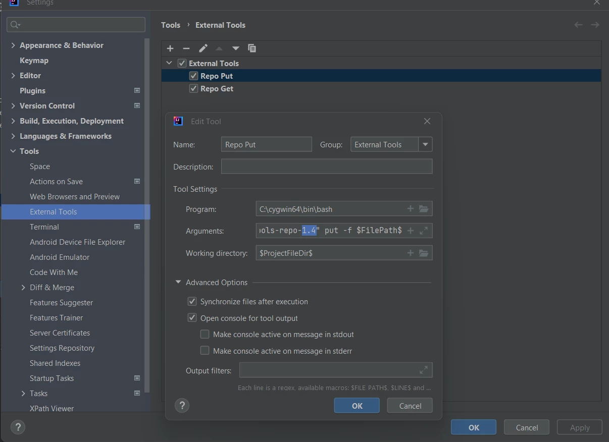 Aregument : -l "C:\Users\Mohammed Skouti\Downloads\tools-repo-1.4\tools-repo-1.4" put -f $FilePath$