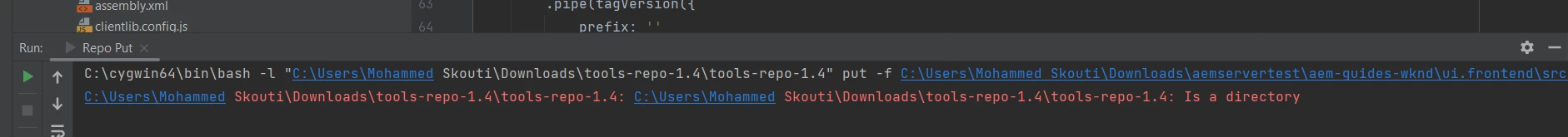 C:\cygwin64\bin\bash -l "C:\Users\Mohammed Skouti\Downloads\tools-repo-1.4\tools-repo-1.4" put -f C:\Users\Mohammed Skouti\Downloads\aemservertest\aem-guides-wknd\ui.frontend\src\main\webpack\static\index.html