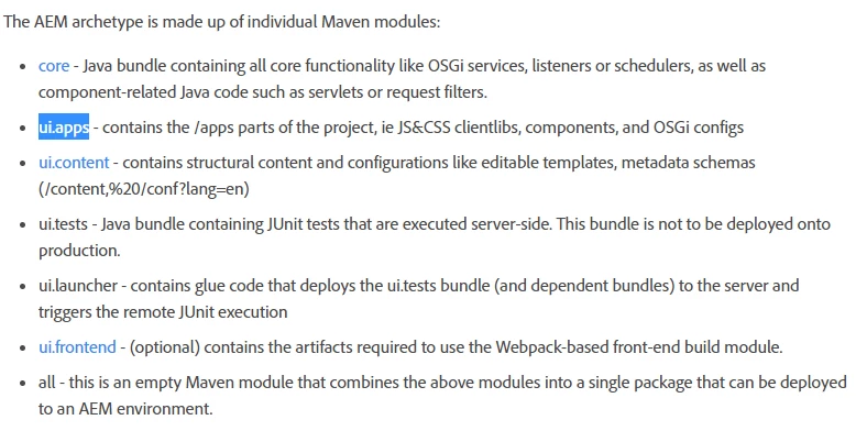 So in AEM, specific code/content/assets will be placed in different modules. Please check the module details below