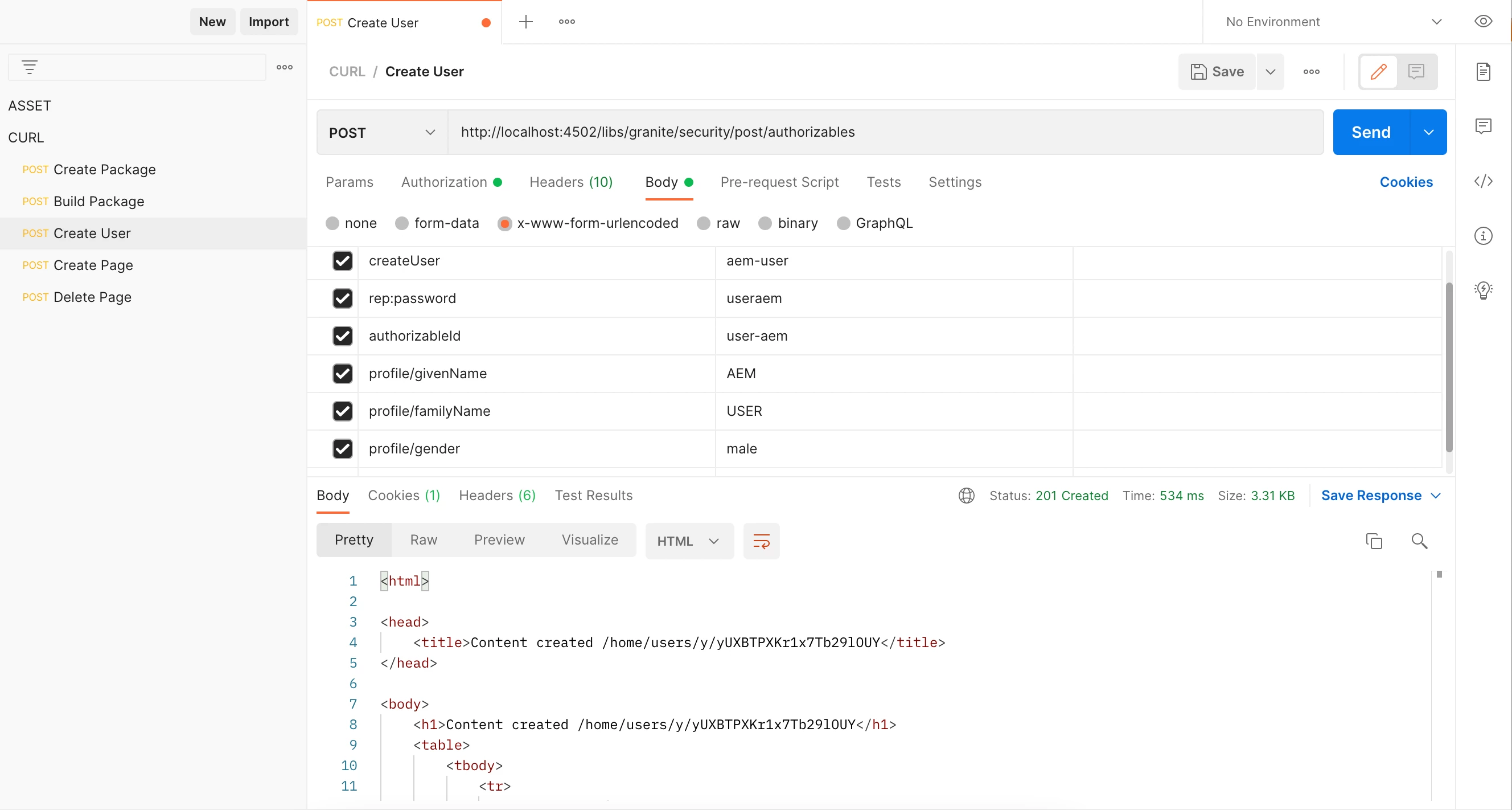 1. create POST request to url - http://localhost:4502/libs/granite/security/post/authorizables
