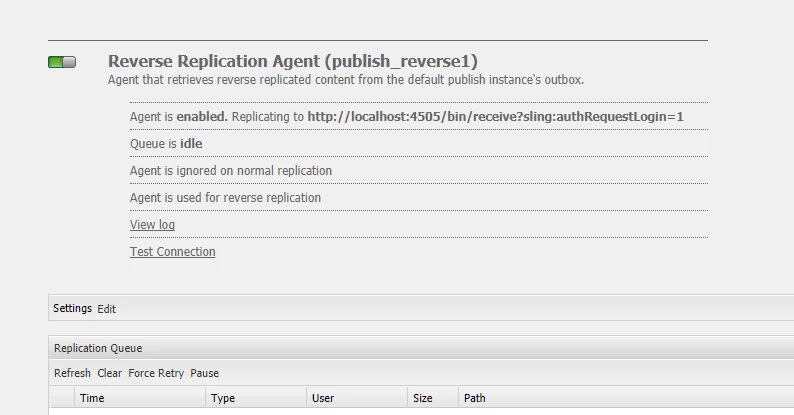 I am trying reverse replication i.e. I have two publish instances running on 4503 & 4505. I have set up the replication agent for 4505 publish instance. I have tested the connection on 4505 and its successful. However, when I am making changes on the publish instance 4503 on the page "http://localhost:4503/content/geometrixx-outdoors/en/community/hiking.html " which has a blog content the changes are seen only on 4503 instance and not on 4505 and the author instance. why is the replication agent not working ? Snapshot of the replication agent is as below. Replication logs are as below