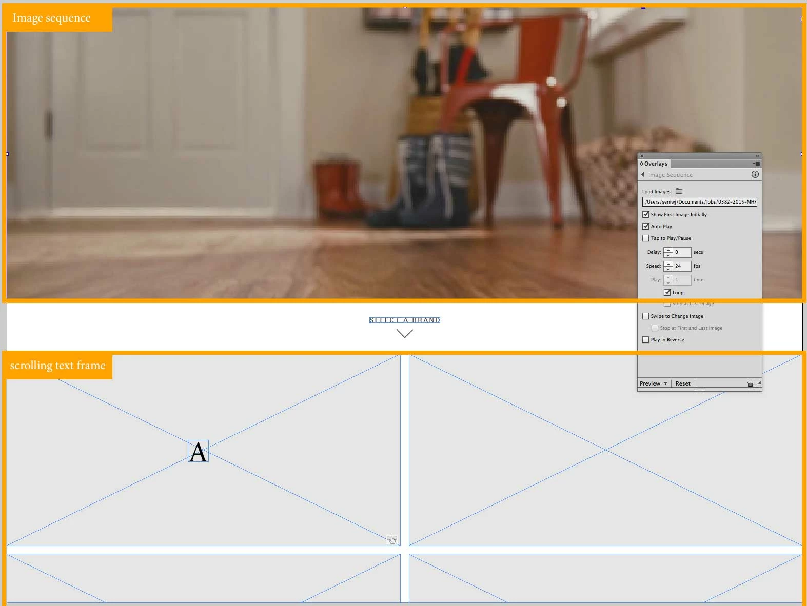 The issue Im running into now is having this faked out rotating banner at the top as a image sequence and a scrolling text frame on the same page. When I scroll up to unveil the other gray boxes in the scrolling text frame the image sequence seems to pause and restart playing from were it left off. I made sure to have the "tap to pause" box unselected. Any thoughts?