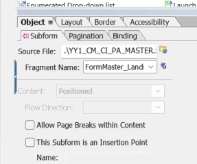 I also notice that even though I have the correct master loaded and the correct fragment selected, it's still saying it is "(untitled SubForm) (page 1) and everything greyed out whereas in other forms it shows Landscape_Factsheet instead and some things not greyed out:
