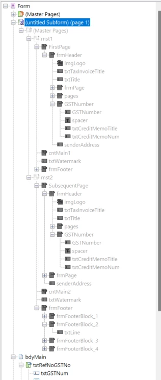xfa.resolveNode("#pageSet[0].mst2.SubsequentPage.frmHeader.GSTNumber.txtCreditMemoTitle") = Concat(Upper(Form.frmHiddenStaticTexts.lblFormTitle.rawValue), " NUMBER" ); //tax invoice number title