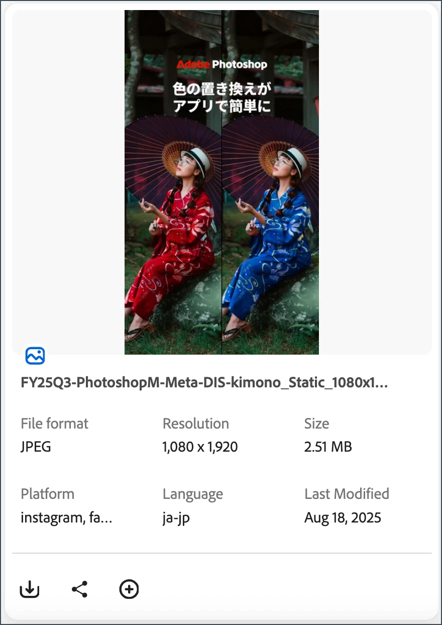 We've done extensive customization on the asset cards. Each card can display up to six metadata fields, including file format, resolution, size, and custom fields like publishing platform and language. This helps users quickly identify relevant assets without needing to click through each one. The asset panel is dynamic, showing only relevant metadata fields for each asset, ensuring users see pertinent information without being overwhelmed.