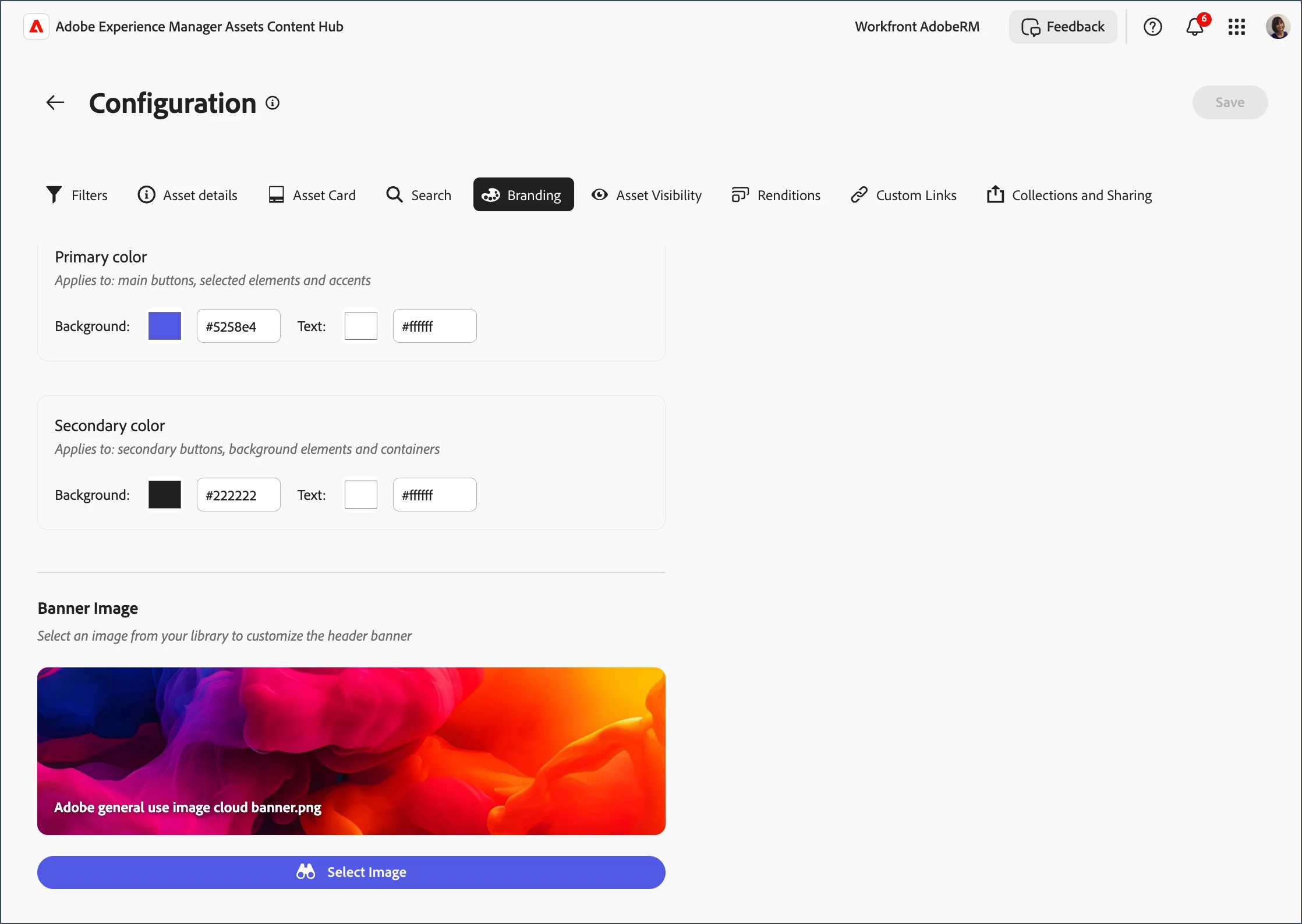 At Adobe, we have branded our Content Hub as the Adobe Marketing Hub, and it's been incredibly easy to configure and align with our existing branding. By simply going to the Branding tab, we set up our title, Adobe Marketing Hub, body text, primary and secondary colors, and banner image--and next we'll be adding our logo, as that is the latest enhancement to Branding. This easy ability to brand enabled a seamless transition from legacy portals and ensures that our branding remains consistent.