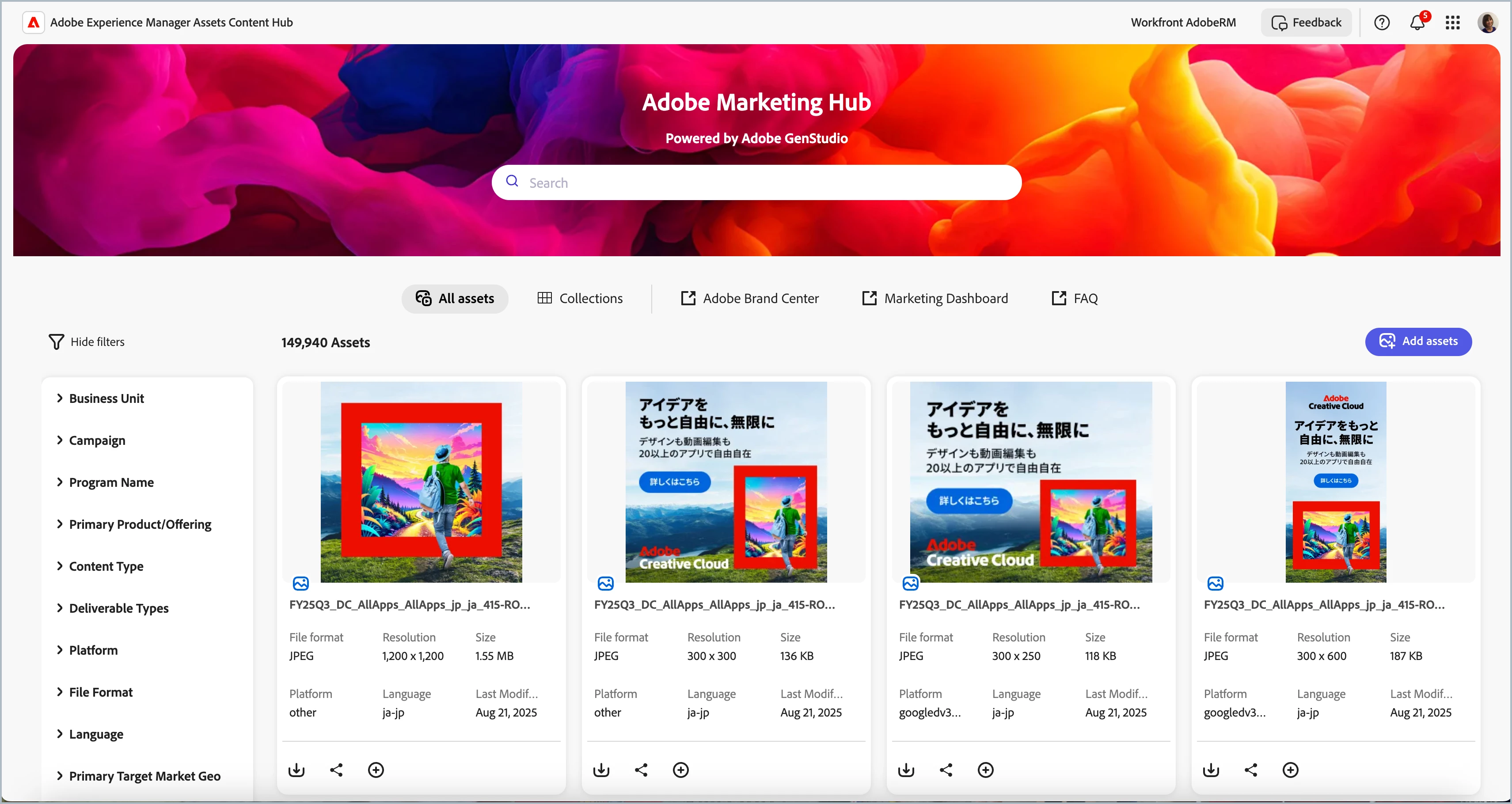 Our Content Hub hosts almost 150,000 assets, catering to different use cases. The most common ones are marketing program assets deployed in social media, email, and web. Additionally, we have all our Adobe Brand assets that every employee needs when they join Adobe. We've also configured web links to our Adobe Brand Center, reporting, and FAQ page, making it easy for employees to find exactly what they need quickly.