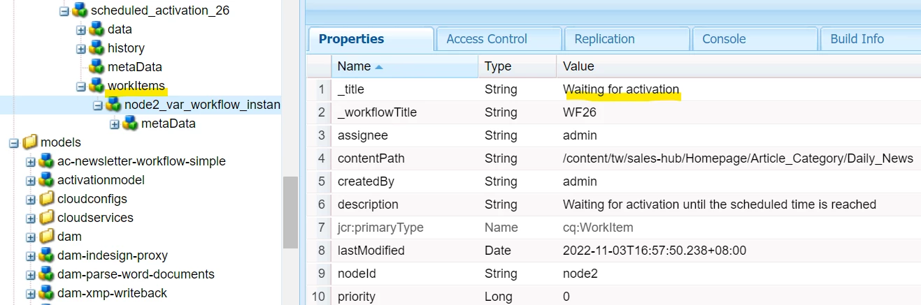 after triggering, the workitem node shows the current step is "Waiting for activation"