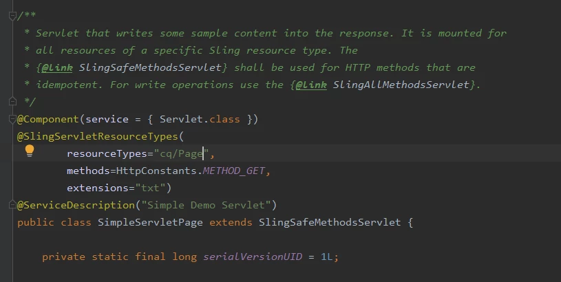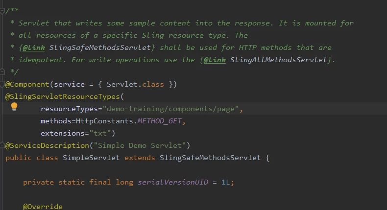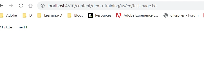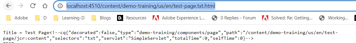 4. Now try to hit the URL as http://localhost:4510/content/demo-training/us/en/test-page.txt.html . This will actually invoke the servlet.