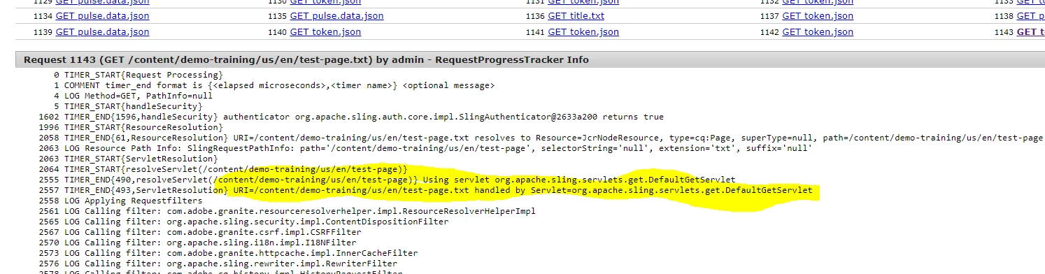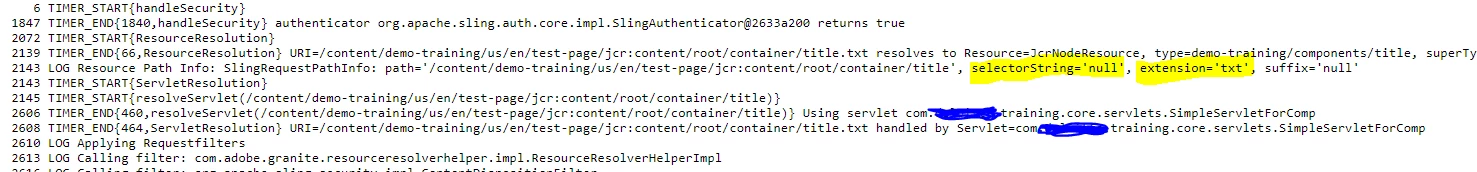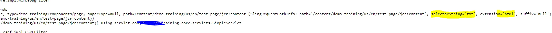 If you scroll down you will see this is then calling our servlet with below information. The request says it has "html" as extension and "txt" as selector.