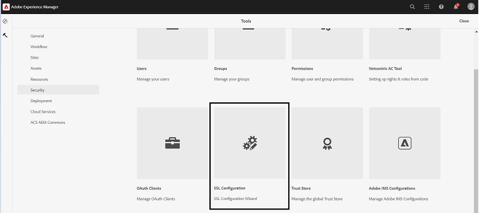 Navigate to SSL Configuration: Access AEM Author and navigate to Tools > Security. Select the SSL Configuration option.