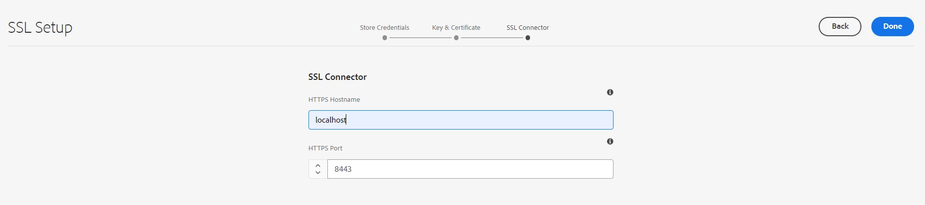 - Update SSL Connector Details: Update HTTPS Hostname value to match the Common Name (CN) from the certificate (e.g., "localhost" in our example). Provide the HTTPS Port value.
