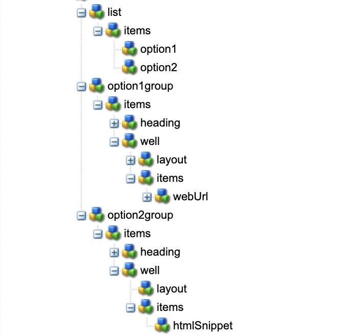 <option1group jcr:primaryType="nt:unstructured" sling:resourceType="granite/ui/components/foundation/container" class="hide test-options-showhide-target" showhidetargetvalue="option1"> <items jcr:primaryType="nt:unstructured"> <heading jcr:primaryType="nt:unstructured" sling:resourceType="granite/ui/components/foundation/heading" class="coral-Heading coral-Heading--4" level="{Long}4" text="Options 1 Group"/> <well jcr:primaryType="nt:unstructured" sling:resourceType="granite/ui/components/foundation/container"> <layout jcr:primaryType="nt:unstructured" sling:resourceType="granite/ui/components/foundation/layouts/well"/> <items jcr:primaryType="nt:unstructured"> <webUrl jcr:primaryType="nt:unstructured" sling:resourceType="granite/ui/components/coral/foundation/form/textfield" fieldLabel="Web Url" name="./webUrl"/> </items> </well> </items> </option1group> <option2group jcr:primaryType="nt:unstructured" sling:resourceType="granite/ui/components/foundation/container" class="hide test-options-showhide-target foundation-layout-util-vmargin" showhidetargetvalue="option2"> <items jcr:primaryType="nt:unstructured"> <heading jcr:primaryType="nt:unstructured" sling:resourceType="granite/ui/components/foundation/heading" class="coral-Heading coral-Heading--4" level="{Long}4" text="Options 2 Group"/> <well jcr:primaryType="nt:unstructured" sling:resourceType="granite/ui/components/foundation/container"> <layout jcr:primaryType="nt:unstructured" sling:resourceType="granite/ui/components/foundation/layouts/well"/> <items jcr:primaryType="nt:unstructured"> <htmlSnippet jcr:primaryType="nt:unstructured" sling:resourceType="granite/ui/components/foundation/form/pathbrowser" fieldLabel="Upload HTML Snippet" name="./htmlSnippet" rootPath="/content/dam/"/> </items> </well> </items> </option2group>​