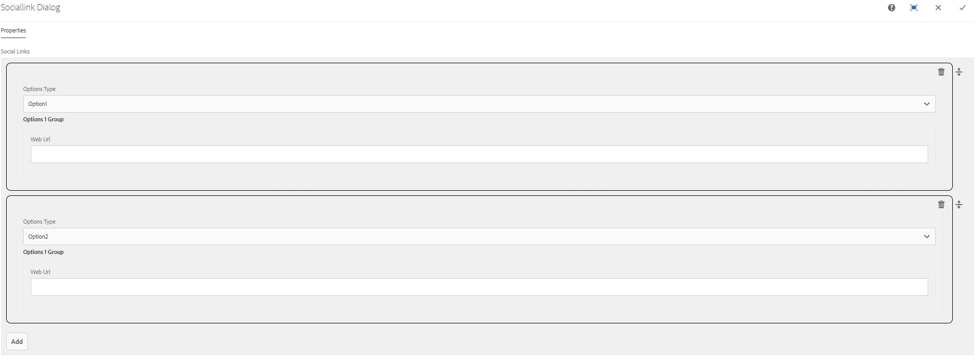 Step 2 — Create container node option1Group of type nt:unstructured and add below properties.